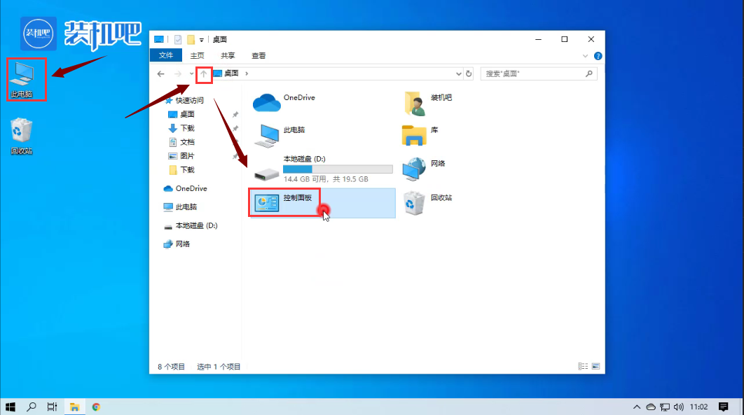 1,首先打开“此电脑”,然后点击界面上方的“上箭头”,选择“控制面板”。