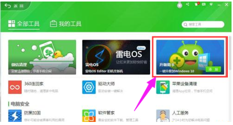 1、下载安装最新版的360,进入页面后点击全部工具,添加右上角的“升级助手”