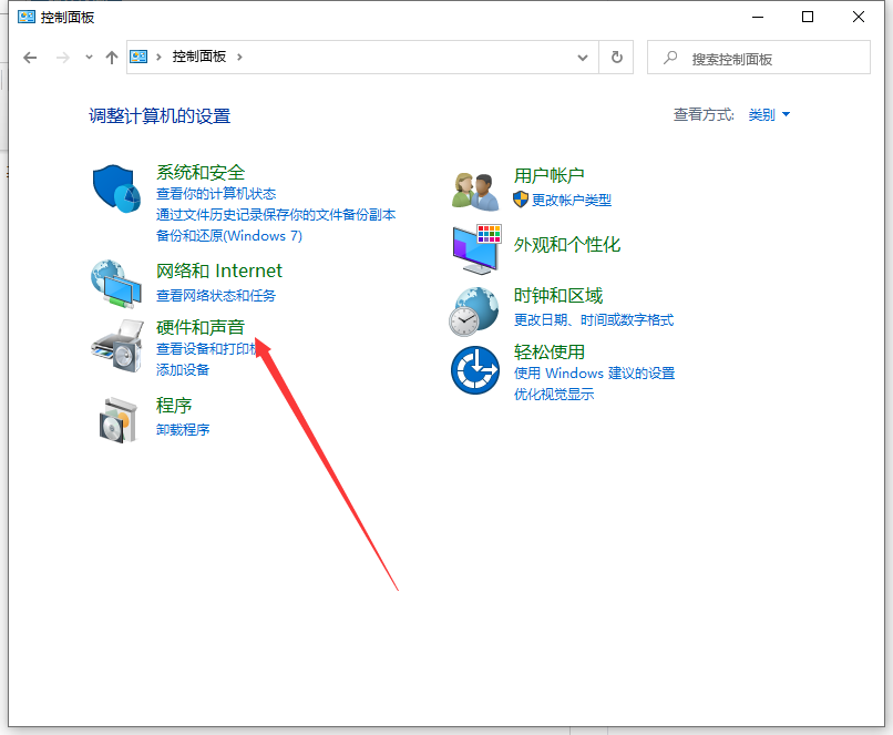 1、打开“控制面板”,点击“硬件和声音”选项。