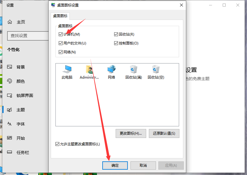3、打开桌面图标设置之后将计算机勾选上,我的电脑在win10已经改名为此电脑了。最后点击确定即可。