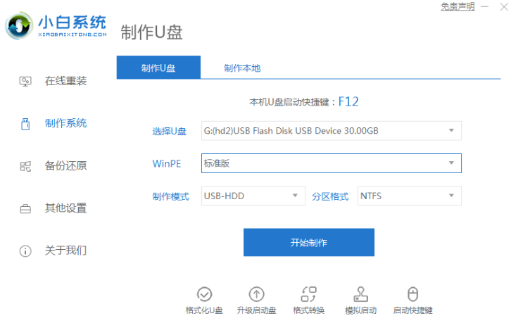 1.先关闭我们电脑上的杀毒软件以防阻止安装步骤,然后打开小白一键重装系统。插入u盘后点击“制作系统”—“开始制作”。