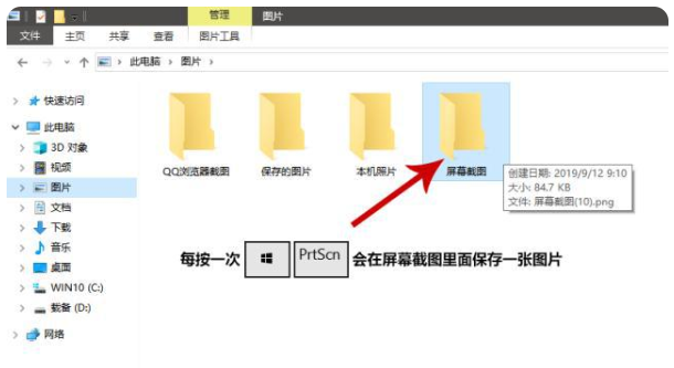 使用PrtSc键截图只是将截图复制到剪贴板里面,而使用WIN键+PrtSn组合键会直接将截图内容保存为一张图片文件到【图片】【屏幕截图】文件夹中。名称为“屏幕截图(10).png”,括号中的数字会自动增长,每按一次WIN+Prtsc组合键保存一张图。