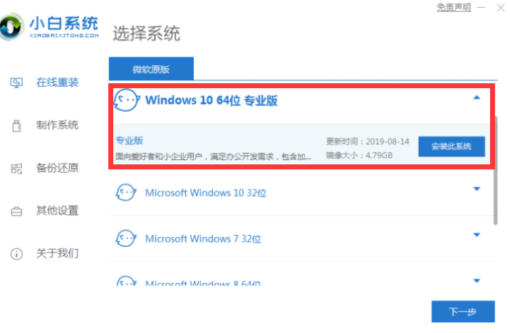 1、我们打开桌面上的小白一键重装系统软件后,点击左侧的在线重装按钮,然后选择自己需要的操作系统进行下载,点击安装此系统。
