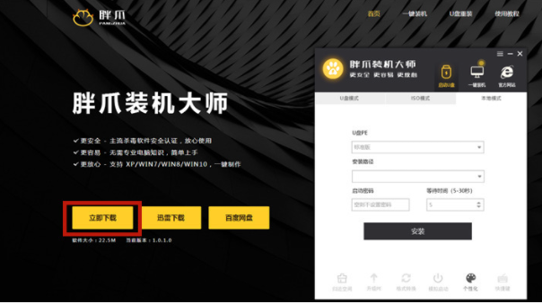 1.首先我们需要一个第三方的u盘pe制作工具,帮助我们把u盘变成pe系统。下面小编推荐大家使用胖爪一键装机大师。点击“胖爪机”主页:zj.xitongcheng.com。接着点击下载,立即下载软件。要注意的是,下载本软件需要提前关闭腾讯管家,360电脑保安等软件。避免系统误报。