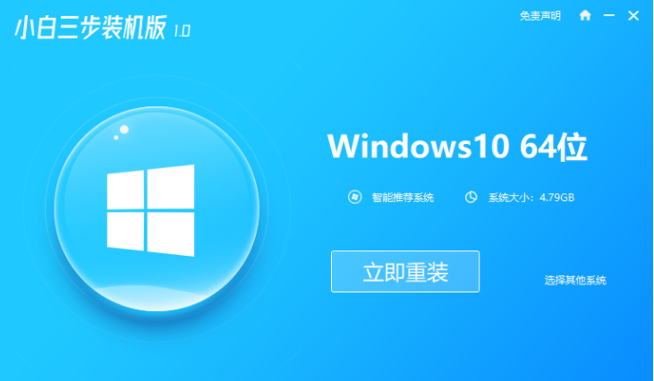 1.到小白官网(www.xiaobaixitong.com)下载小白三步装机版软件并打开,默认推荐我们安装win10专业版,点击即可重装。提示重装建议退出安全软件。
