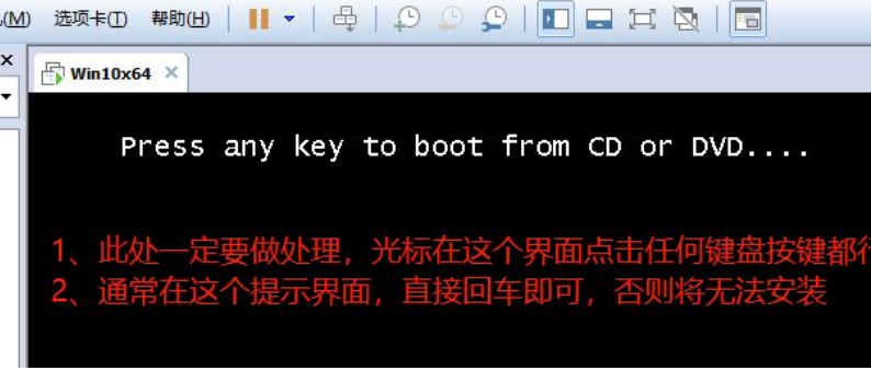 10、虚拟机中开始安装win10的时候,出现界面【Press any key to boot from CD or DVD ...】,此时一定要将光标至于虚拟机中,然后按任何一个按键,通常按回车即可。如果这一步没有及时按的话,就会出现第二个图一样的界面,此时只能重启安装,重新选择了。