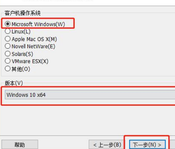 4、选择客户机操作系统为【Microsoft Windows(W)】,版本选择【Windows 10 x64】,点击【下一步】按钮。