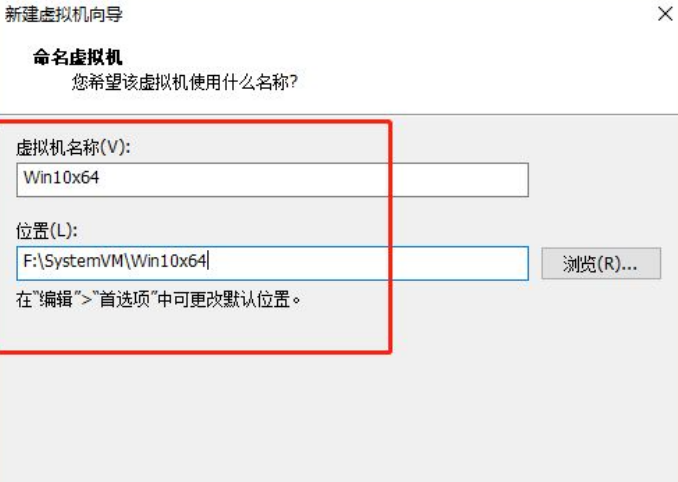 5、给虚拟机取一个名字,再选择一个虚拟机文件的存放位置,然后点击【下一步】按钮。