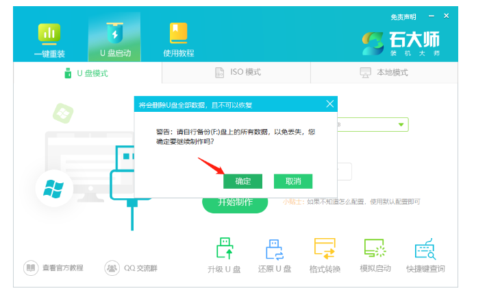 2、制作U盘启动盘时,软件会提醒用户备份U盘中的数据,防止数据丢失造成损失。