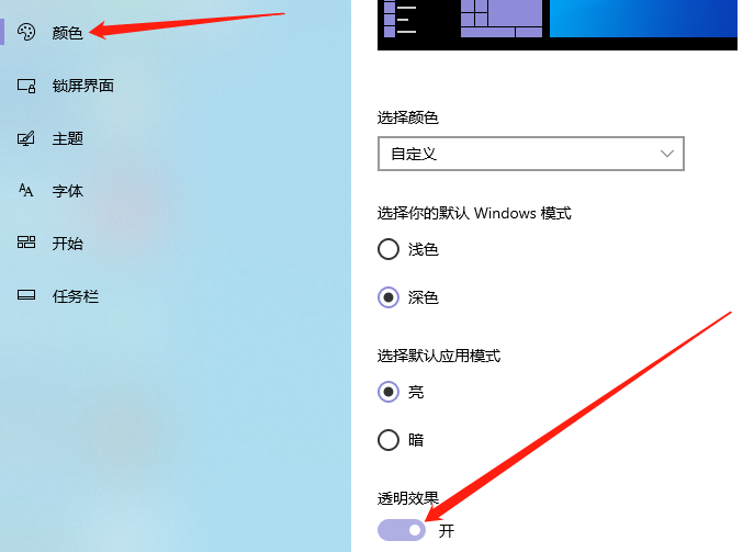 2.进入后,点击【颜色】,并在右边开启【透明效果】即可设置win10任务栏透明状态。