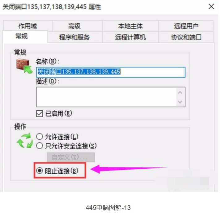 点击“协议和端口”,可以看到阻止连接的本地端口是之前设置的135,137,138,139,445,说明网络端口135,137,138,139,445已经阻止连接
