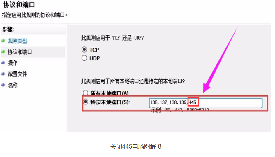 选择“特定本地端口”,输入135,137,138,139,445,中间用逗号隔开, 特别注意这里的 逗号 一定是英文的逗号