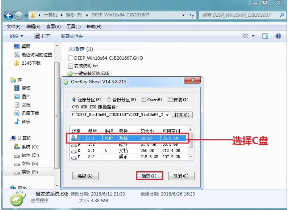 3、双击"安装系统.exe",选择"C盘"(C盘为系统磁盘),接着点击执行。(执行安装前要把360等杀毒软件关闭,否则无法正常安装。)