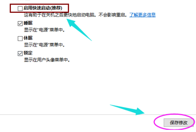 5、清除勾选“启用快速启动(推荐)”项,点击“保存修改”按钮完成设置。