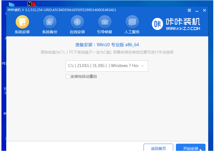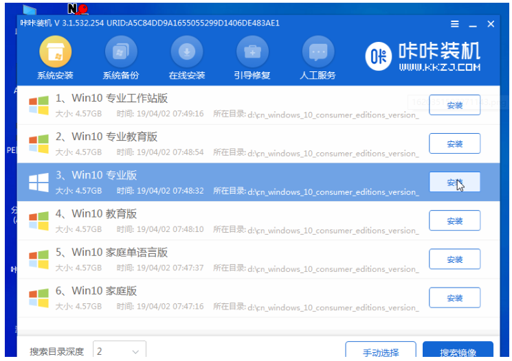 5.然后我们打开pe系统桌面上的卡卡安装软件,选择win10系统点击安装选项。