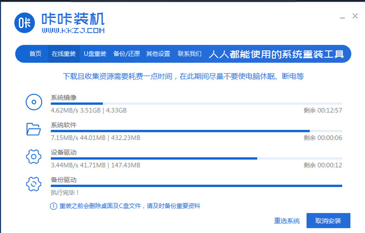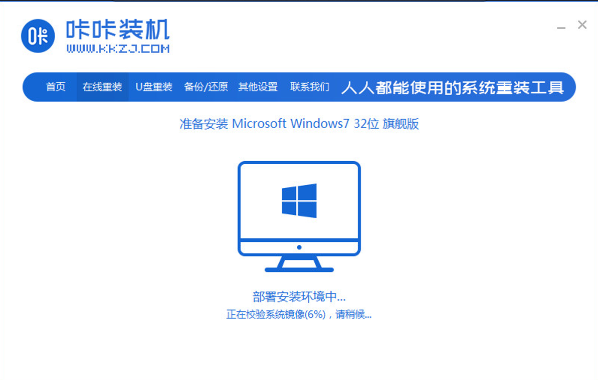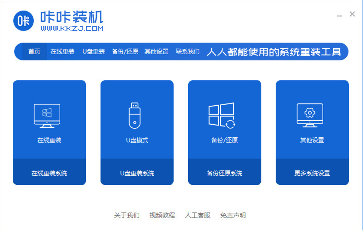 1、下载安装咔咔装机工具,选择在线重装。