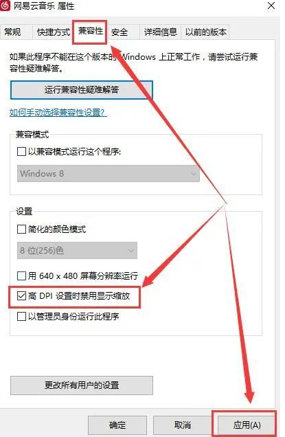 2、然后切换到兼容性一栏中,勾选“高DPI设置时禁用显示缩放”,就能够解决了。