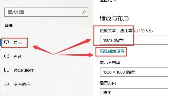 2、然后在“显示”一栏中,将“缩放与布局”改成100(推荐)。然后点击下方的“高级缩放设置”