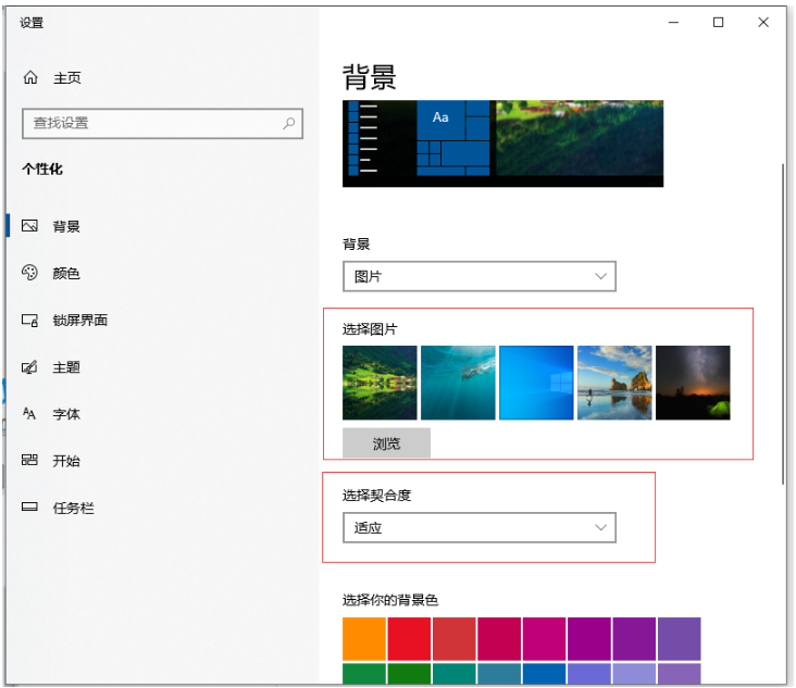3、可以看到"选择图片",这里面就是系统自带的几幅图纸,选择以后,就可以将其更改成想要的桌面背景了。另外更改后还可以调整壁纸和桌面的切合度。