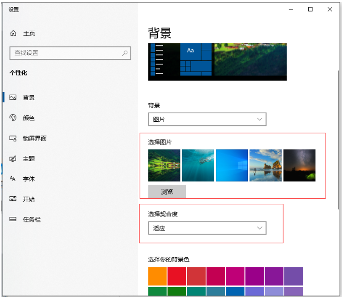 3、在右侧栏目能够看到"选择图片",这里面就是系统自带的几幅图纸,点击选择后就可以将其设置成桌面背景了。另外还可以根据需要调整壁纸和桌面的切合度。