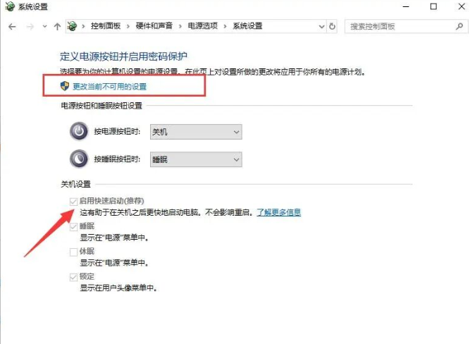4、点击更改当前不可用的设置,勾选下方的启动快速启动,点击保存修改。