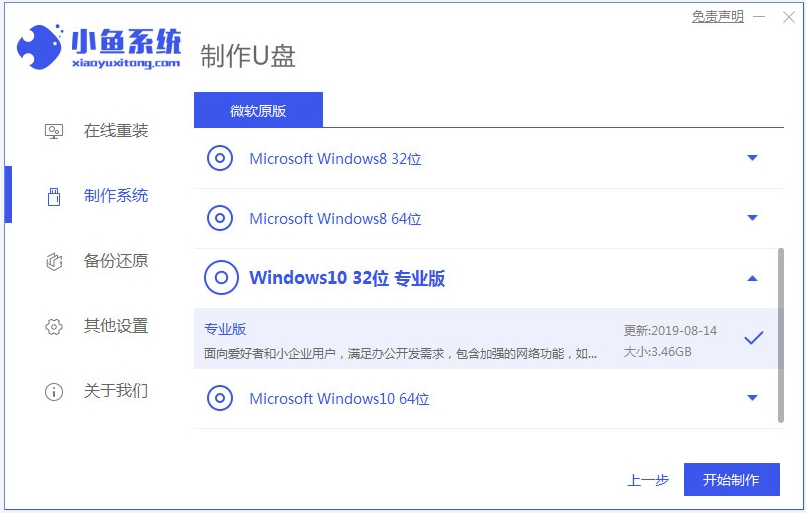 1、自行在电脑安装小鱼一键重装系统工具并打开,插入空白u盘,然后按照图示点击开始制作。