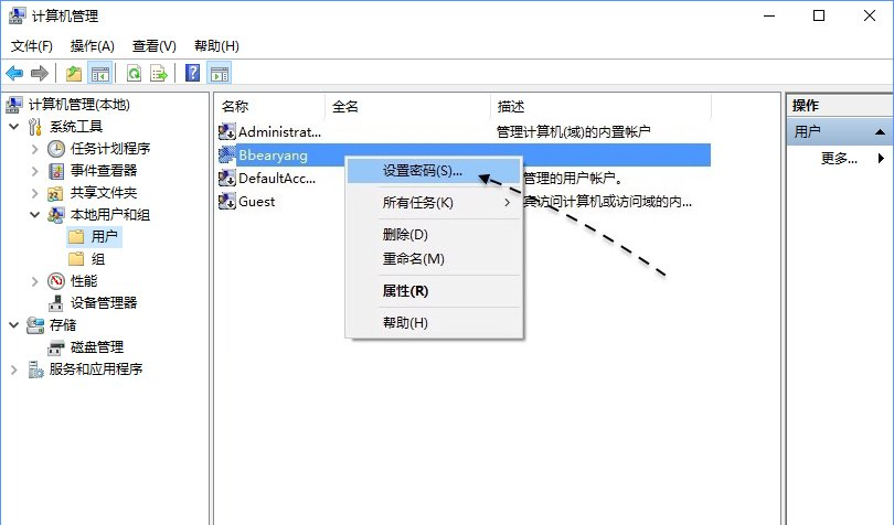 2、在计算机管理窗口中,点击左侧“本地用户和组”选项下的“用户”选项,找到当前用户帐户;
