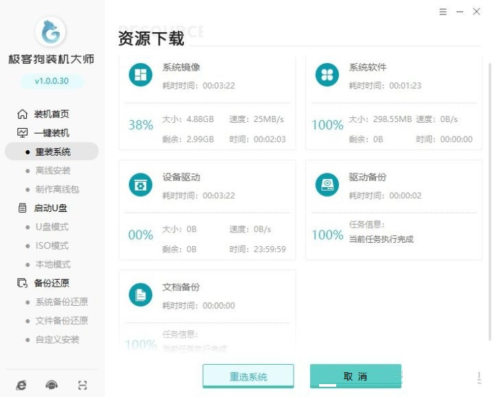 5、进入了极客狗PE系统中,无需操作,装机软件会自动安装系统并重启,大家耐心等待即可。