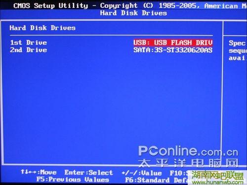 在设备启动顺序中,将USB设备设定到硬盘的前面,只要U盘启动顺利,就可以进入到DOS系统中。