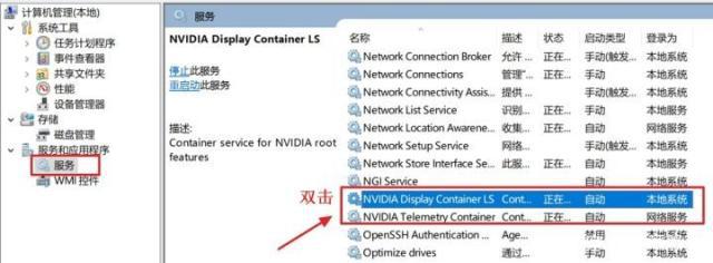 2、此时可以桌面右键点击“此电脑”--“管理”--“服务和应用程序”--“服务”,然后双击Nvidia Display显示服务;