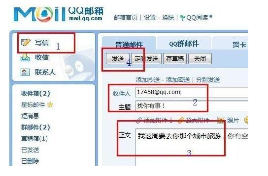 QQ邮箱格式书写和发送和163的邮箱基本上是一样的,先登录https://mail.qq.com,也可以直接从QQ面板点邮箱图标进入,然后如上图的步骤: