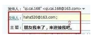 第二步:然后写收件人的邮箱,如haha520@163.com, 如果用的是QQ的邮箱,haha520@163.com为收件人邮件地址。只是各个邮箱后缀不一样,我们这收件人用的是163邮箱,其它的也类似,简单改动即可。