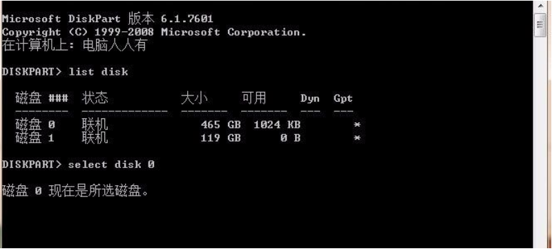 这里显示的是磁盘0,然后输入:select disk 0 回车选择磁盘0。