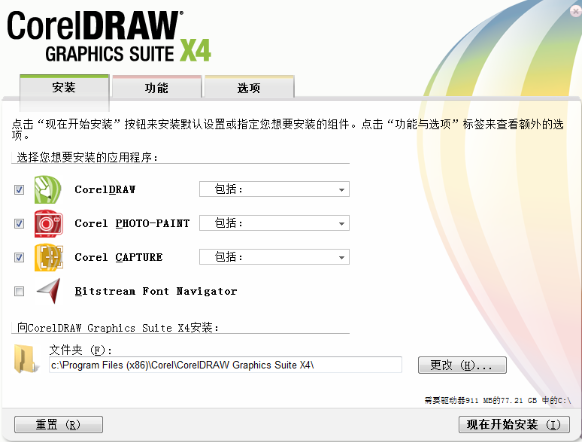 6.接着我们在安装界面里先把CorelDraw X4安装目录设置下,单击【更改】设置即可。