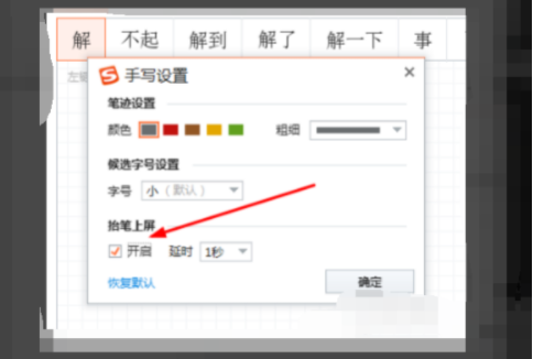 4、进入到手写设置选项中,就可以勾选开启抬笔上屏这样输入会更快些,这时即可完成操作。