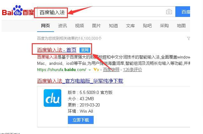 1、以百度输入法下载为例,首先我们在打开电脑浏览器,在百度搜索“百度输入法”,然后找到官网下载地址;