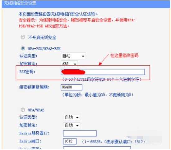 3、在无线安全中PSK密码一栏输入想修改的密码,然后下拉点击保存新密码即可。