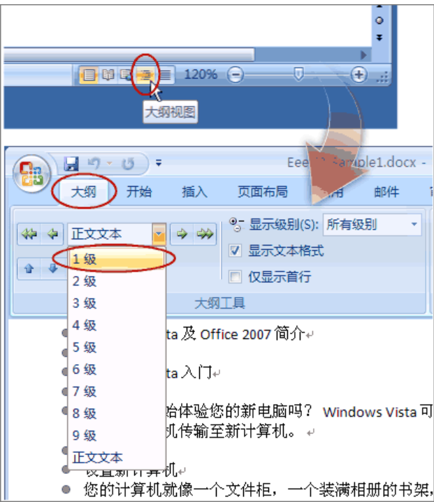 2、光标停在某个第一级标题上,左上角的下拉框拉开,选1级。同样,光标停在某个第二级标题上,下拉框中选2级。这样,把整个文档的结构给标注出来。