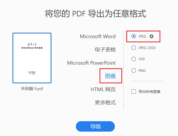 3.选择图像作为导出格式,然后选择 JPEG。