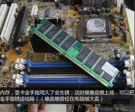 4、如果还是不行,则取出显卡和内存条,用橡皮擦擦拭,接着用毛刷清扫,插槽的灰尘和风扇也要进行清扫,或者更换插槽等。