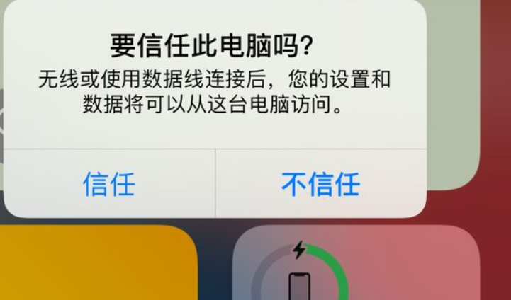 2、电脑连接iPhone后,手机端会弹出一个“信任”的提示,选择点击“信任”。