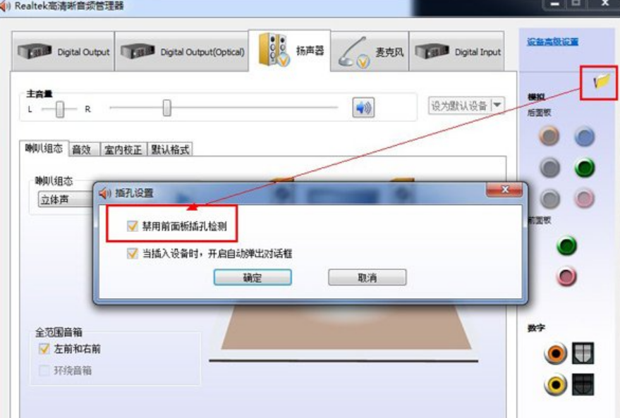 1、打开控制面板找到音频管理器,点击右侧插孔设置,勾选禁用前面板插孔检测,点击。