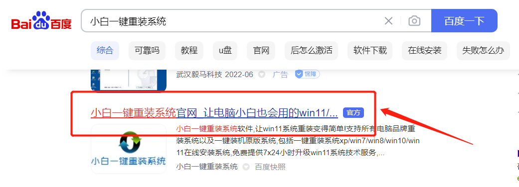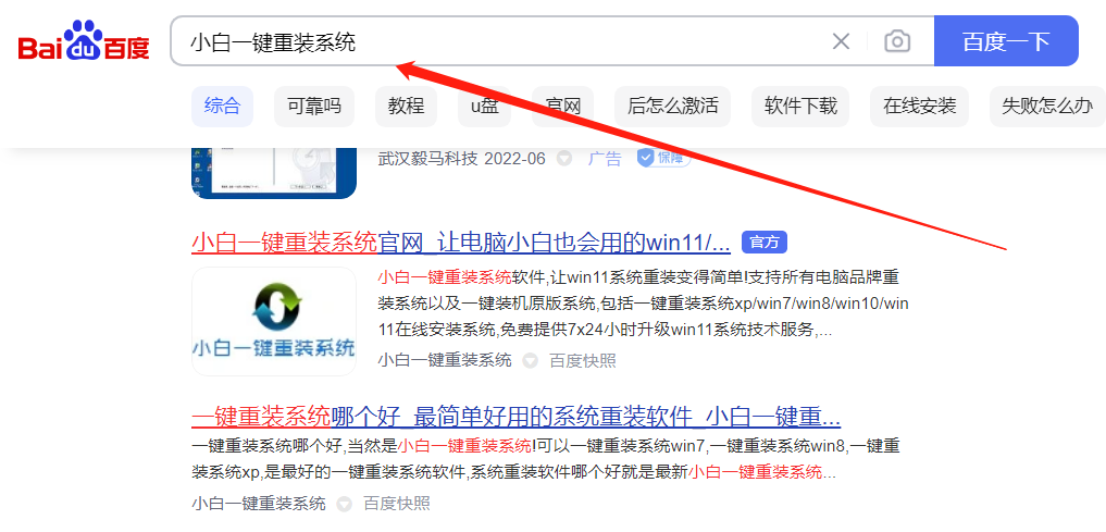 1、在百度搜索中输入小白一键重装系统,然后点击百度一下。