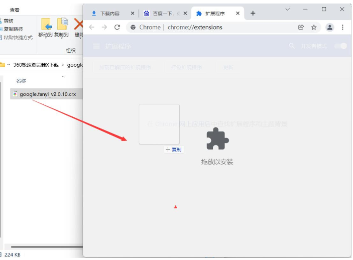 4、把crx格式的浏览器插件用鼠标拖动到浏览器上。
