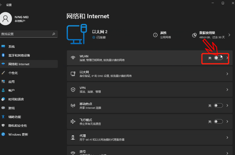 2、点击WLAN旁边的开关按钮变成“开” ;