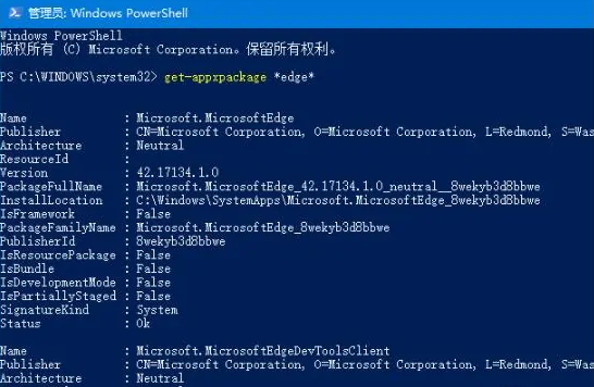 2、在这里输入代码 get-appxpackage *edge*,查找edge浏览器的安装包名称。