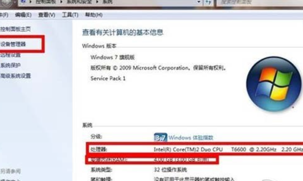 2、在属性里我们可以看到基本的CPU和内存配置,左侧设备管理器有详细数据。