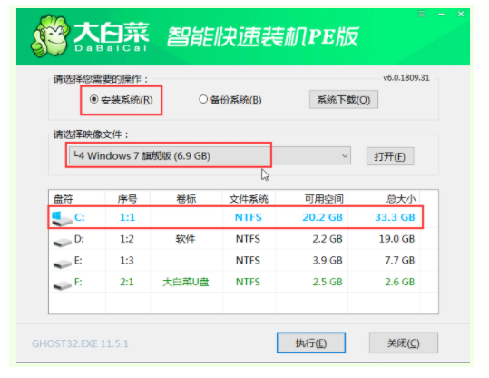 如果您在重装前准备好了系统镜像,可在第四步中选择“安装系统”,选择下载好的系统镜像和安装路径安装在C盘中,然后点击“执行”。接下来的操作和如上所述一样,这里就不加以赘述了。