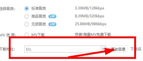 2、点击“更改目录”选择音乐下载储存地,还可以选择种音质。