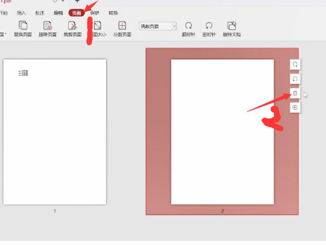 2、切换到页面选项卡,然后将鼠标光标移动到需要删除的空白页面上,单击右上方的删除图标。